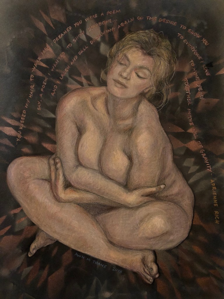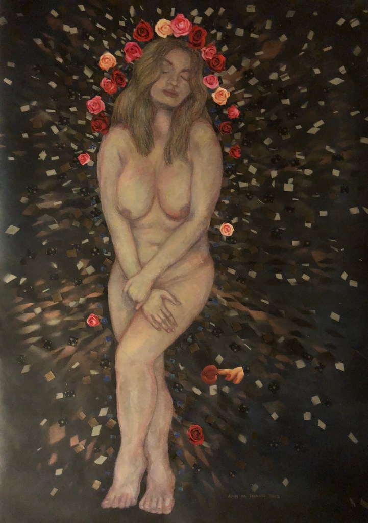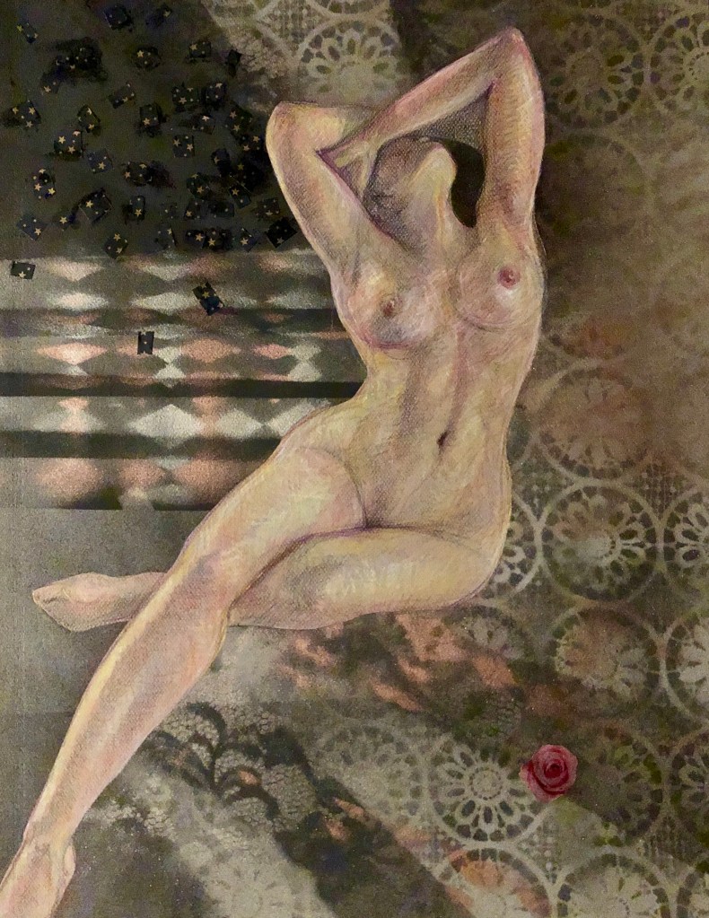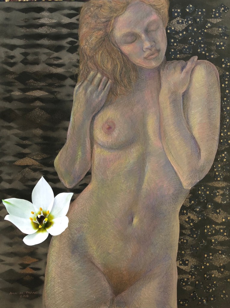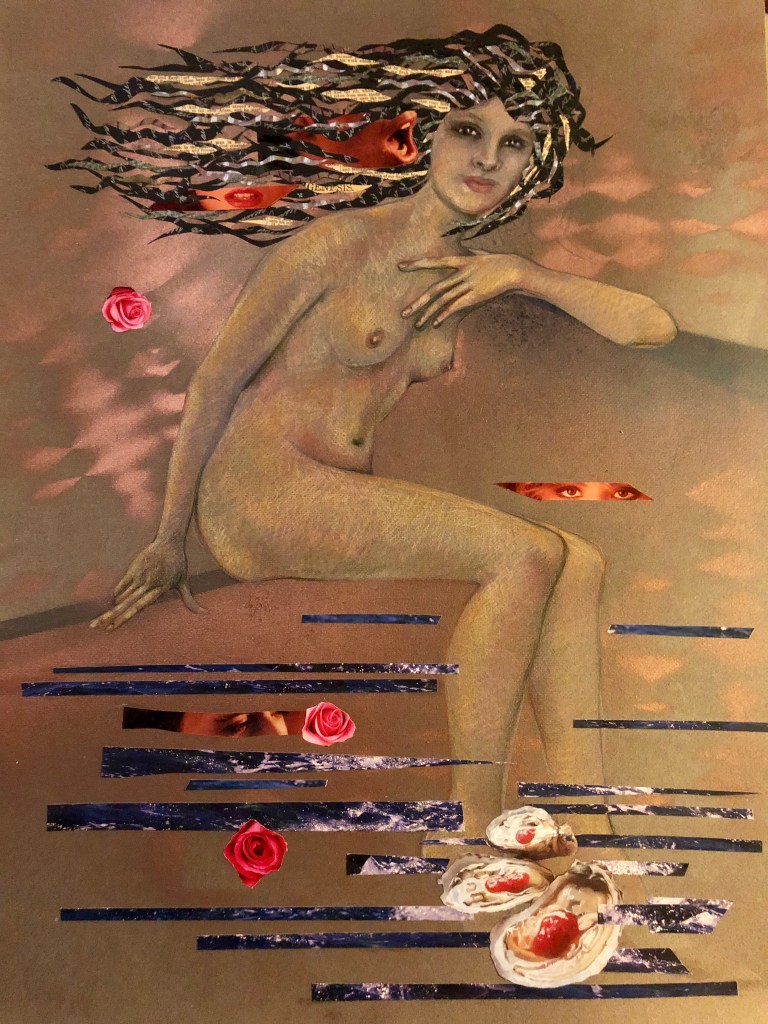 - Aphrodite: colored pencil, pastels, ink, spray paint, collage; 19.5″x 25″