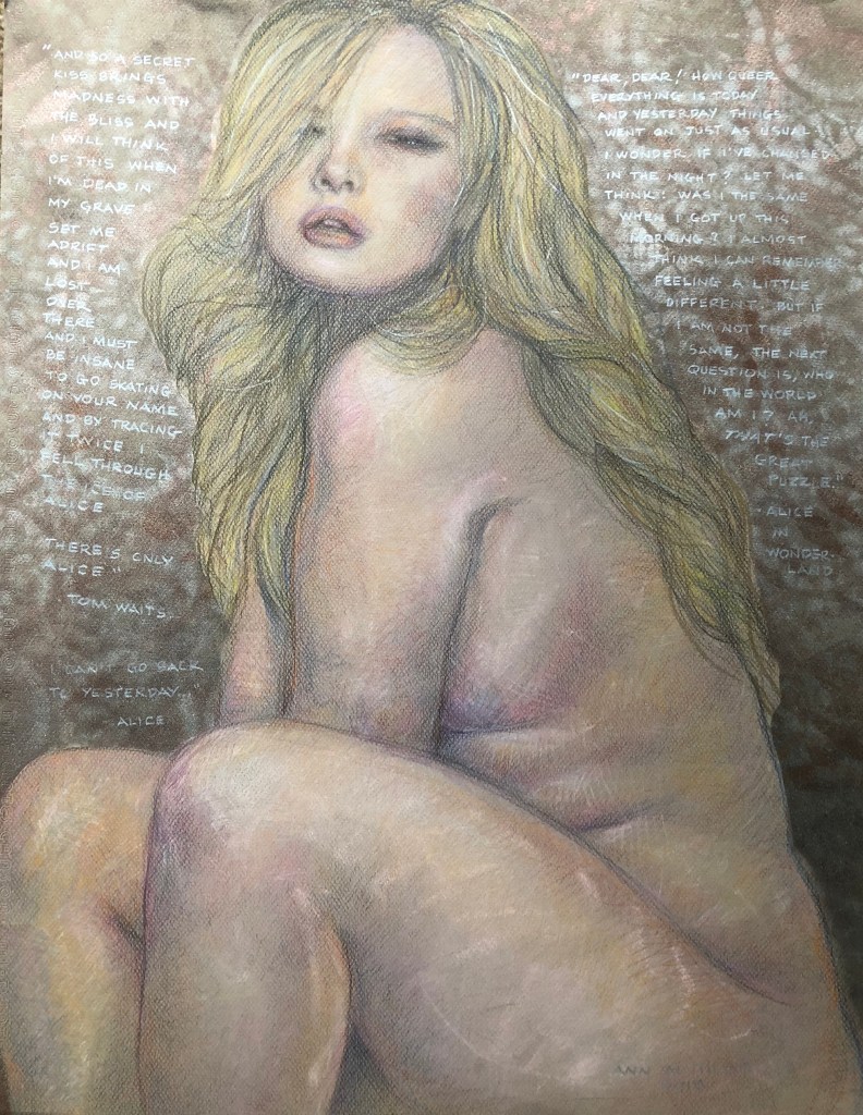 - Alice: colored pencil, pastels, ink, spray paint, collage; 19.5″x 25″